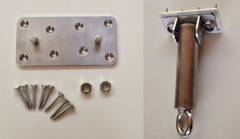 Puuseinäkiinnityslevyn koko on 80mm x 160mm. Kiinnitysruuvien reiät ovat tarkoituksella hiukan ”vinksallaan”, jotta ruuvit ovat puun syiden suhteen hiukan eri kohdilla, mikä vähentää puun halkeamisriskiä. Kiinnitysreikien esiporaus puuhun esim. 3mm poralla vähentää myös puun halkeamisriskiä.